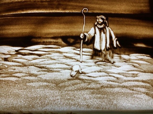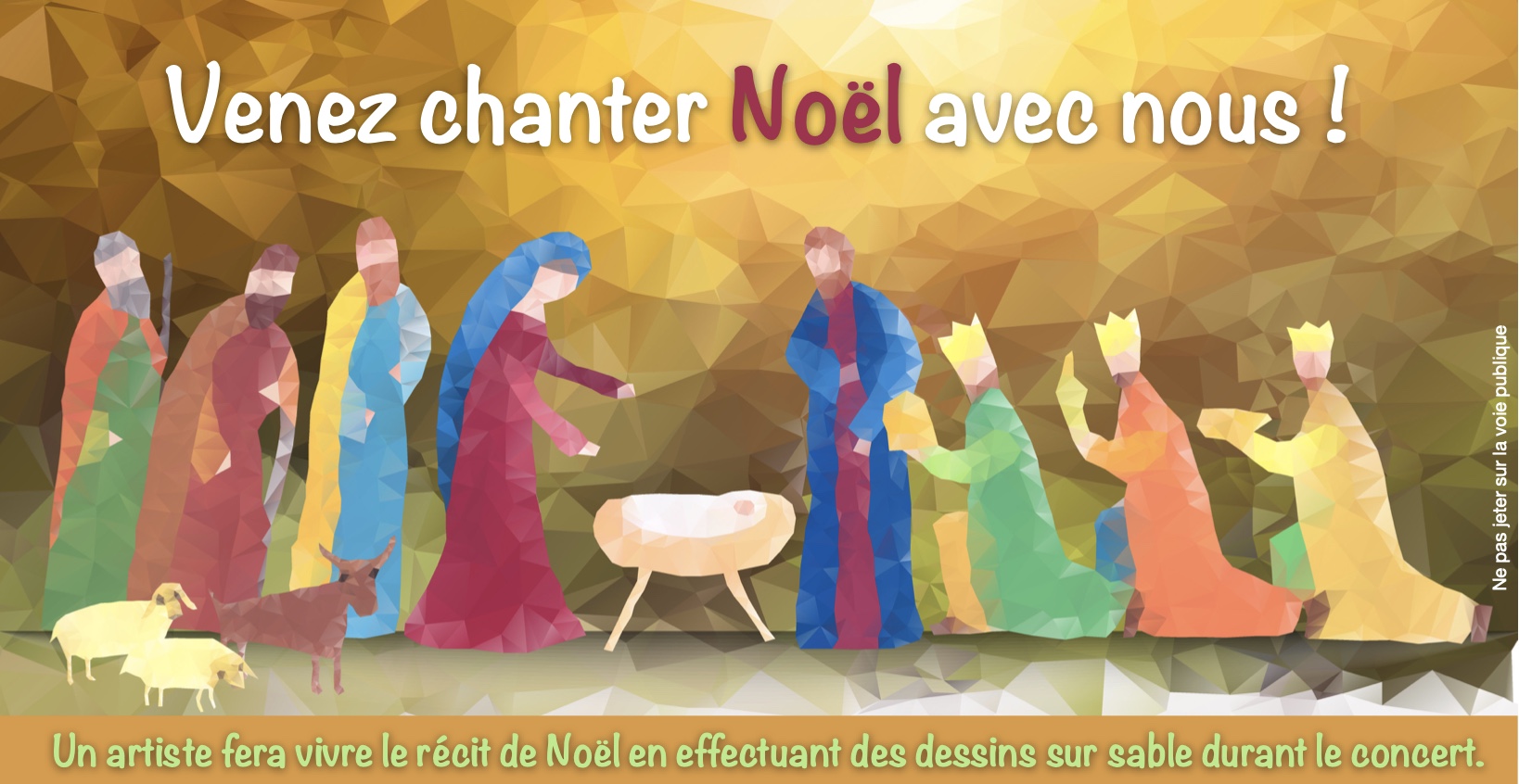 Chants de Noël liturgiques traditionnels d’hier et d’aujourd’hui interprété par une chorale, accompagné du texte de la nativité et de dessins sur sable effectués en direct par Yannick Barbe.