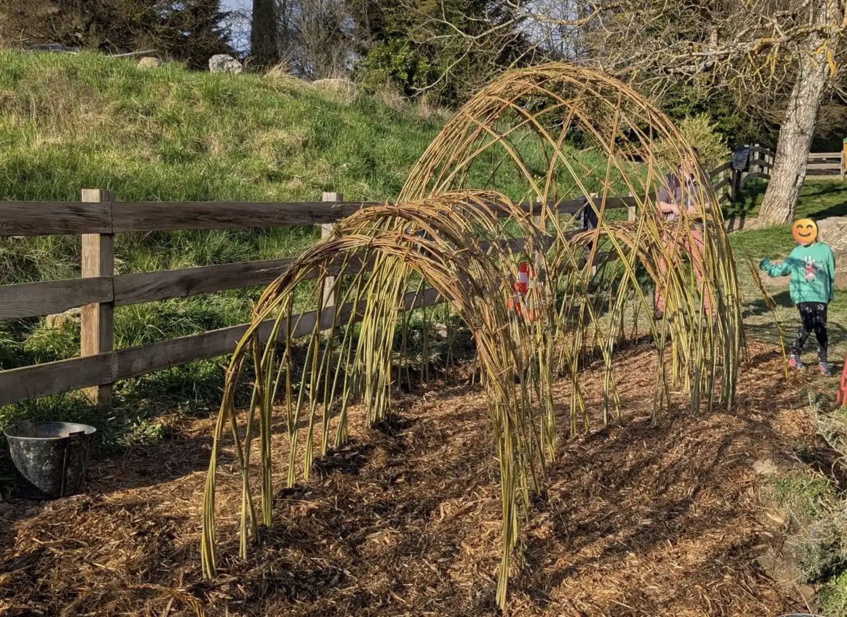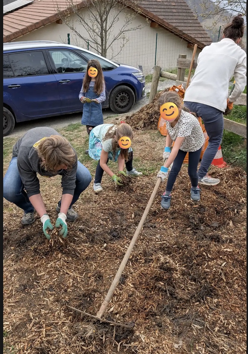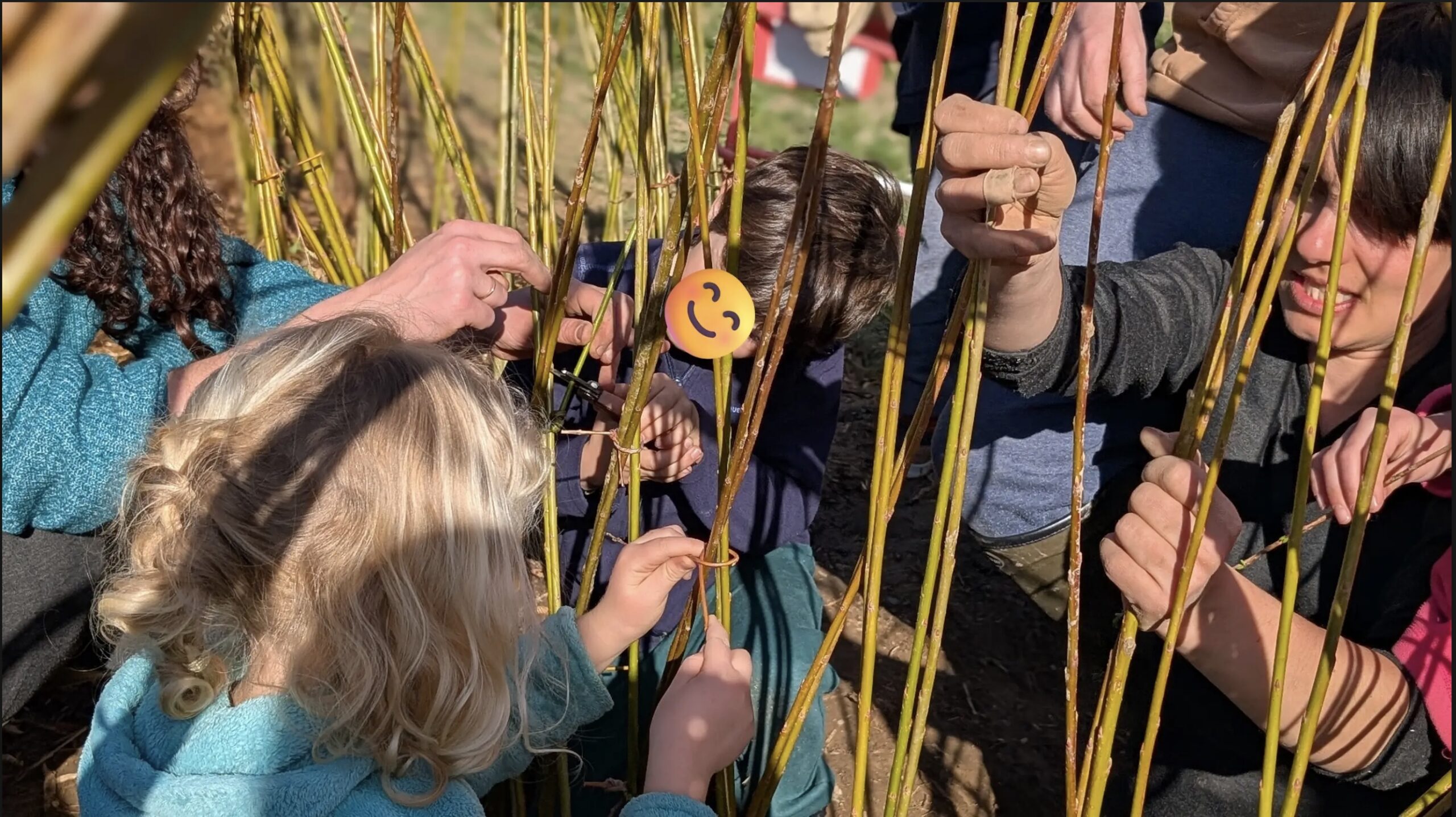 Les enfants de l’école ont participé à chaque étape de l’installation de la cabane, avec l’aide de parents volontaires : préparation du sol, plantation de l’osier, tressage et nœuds des brins d’osier pour former un igloo et deux tunnels d’accès. Les plus jeunes ont pu recouvrir de broyat pour protéger de la sécheresse et rendre le sol de la cabane propice au jeu.